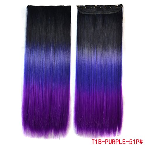 Black to purple to grape purple three Colors Ombre hair extension, Synthetic Hair extensions UF204Length: Approx. 24 inches; Width: 9 inches (5 clips), ear to ear; Weight: about 4.5Oz (125g).Top: 1B, Off Black 30%, Middle: #purple (20%), Bottom: #51P (50%).High Heat Resistant Hair which can be Permed, Straightened, Curled by iron below 300 Fahrenheit. Reusable, Washable, will keep style by using a little shampoo washed in cold water. Transforming your look in seconds, can be worn for a prom, wedding, or evening out.