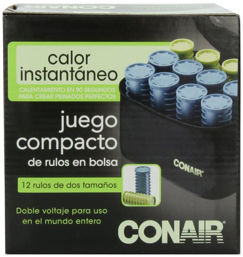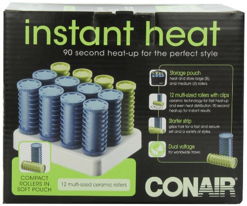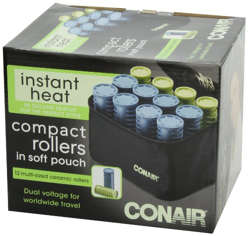 When you’re on the go and there’s no time to stop at the stylist’s, just plug in this set of 12 multi-size rollers to give your hair an instant refresh. The Conair Instant Heat Travel Hair setter comes with 8 large rollers, 4 medium rollers, clips and a soft black carrying pouch with zipper and handle. Rollers have sure-grip starter strips and ceramic technology for even heat distribution. Pouch comes with inside pockets for clips and access slot in back for the cord. Dual voltage systems let you take this handy little pack worldwide. Imported. Pouch: 4-1/2Hx6W”.Compact setter in a soft fabric pouch Ion Shine technology. Heats up in 90 seconds. Includes 12 patented design rollers: 8 large, 4 medium Unique starter strip.