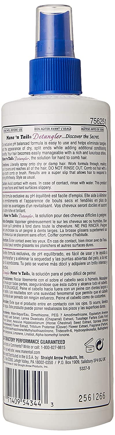 The solution for hard to comb hair is the Detangler by Mane ‘n Tail. It is an easy to use spray that helps eliminate tangles, knots and the appearance of dry split ends. Hair becomes easily manageable with rich, luxurious shine. It is formulated with natural herbal extracts to help nourish, strengthen and fortify. It also helps prevent hair loss due to breakage and is safe and gentle for all hair types. Originally a line targeted to show horses, Mane ‘n Tail expanded their formula when consumers discovered the secret to horse-owner’s great hair – they were using their horses shampoo and conditioner on themselves! Mane ‘n Tail now has a variety of hair, hand and nail products for a range of hair and skin needs.Helps eliminate tangles and knots and the appearance of dry split ends. Formulated with natural herbal extracts to help nourish, strengthen and fortify. Safe and gentle for all hair types.