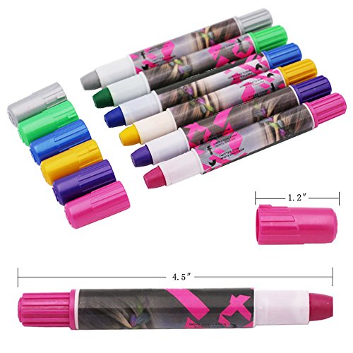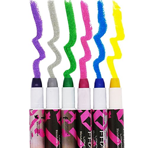6 Hair chalk pens included 6 bright colors: Silver, Yellow, Rose Red, Purple, Green, Blue; Metallic colors, glitter effect, shows nicely and shiny on all hair colors. Colors can be blended together or can be do individually, make your hair match variety of colors. Easy to apply and dries in 30 seconds, last for about 3 days on hair, easy to wash, it can be washed out normally (for different hair texture may be washed twice).With a waxy lipstick texture, Twist to open, No messy on hands, It goes on beautiful and smoothly on hair. Self sealing on to the hair. Safe for hair and skin. Non Toxic. Recommended for children 5 years age and older.