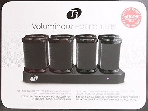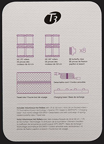 T3 has reinvented hot roller technology to create contemporary looks with voluptuous waves or curls and incredible shine. With advanced technology in each roller, every strand of hair will have volume, shape, movement, and shine. The Voluminous hot rollers set has been designed with proprietary Tourmaline® technology and a ceramic core, which emits ionic, infrared heat to safely penetrate the hair shaft, effectively styling the hair from the inside out while sealing the hair cuticle against frizz. The velvet flocking along the roller surface enhances the effects of Tourmaline, imparting natural shine to hair during the styling process. This set features 4 extra large rollers and 4 large rollers, which are idea for creating voluminous curls or soft waves. Other features include: 8 Spring-Loaded Clips; Charging Base; Auto World Voltage (100-240V); Detachable Cord; Luxe Storage Tote; 2-Year Warranty.4 XL and 4 Lg rollers 1.75″ and 1.50″ rollers are ideal for creating voluminous curls or soft wavesTourmaline, Ionic & Ceramic Maximum levels of ions and infrared heat retain healthy moisture for a radiant finish and seal the hair cuticle to fight frizzFlock coating Professionally-proven as the most effective method of delivering naturalshine”B005SPWI3O”]