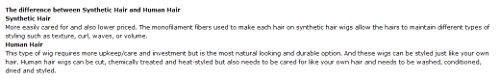 More easily cared for and also lower priced. The monofilament fibers used to make each hair on synthetic hair wigs allow the hairs to maintain different types of styling such as texture ,curl, waves, or volume.