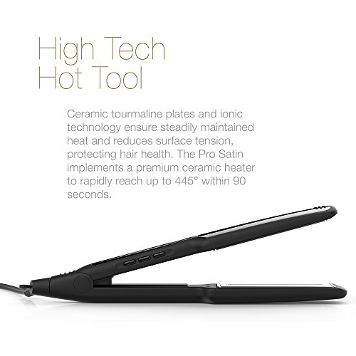 Lock in natural moisture, protect your hair cuticles and add silkiness and shine that last all day using the Pro-Satin’s infrared heat technology. Regular heat damages the surface of the hair and causes frizz, but far infrared rays work by penetrating the innermost layer of the strands, heating them from the inside out. This means less stress on the cuticle, and healthier hair. Ceramic tourmaline plates use ionic technology and reduce the hair’s surface tension, leaving locks shiny and frizz-free. The Pro-Satin also features a temperature regulation function to inhibit burning and an advanced microprocessor that allows for 10 specific heat settings between 265°F and 445°F. The superior quality ceramic heater enables the flat iron to reach maximum temperature within 90 seconds and allows for quick heat up recovery. The convenient auto-shut-off function will turn off the device when left unattended so you never have to worry about rushing out. New, highly efficient infrared heat technology causes less damage to hair cuticle. Extra-wide, 2-inch bottom floating plate, plus upper Dual-Plate technology that maintains even heat. Advanced microprocessor allows you to choose from 10 temperature settings between 265F-445F. 90-second heat-up, plus auto-shutoff function. 360° swivel cord (8 ft.)